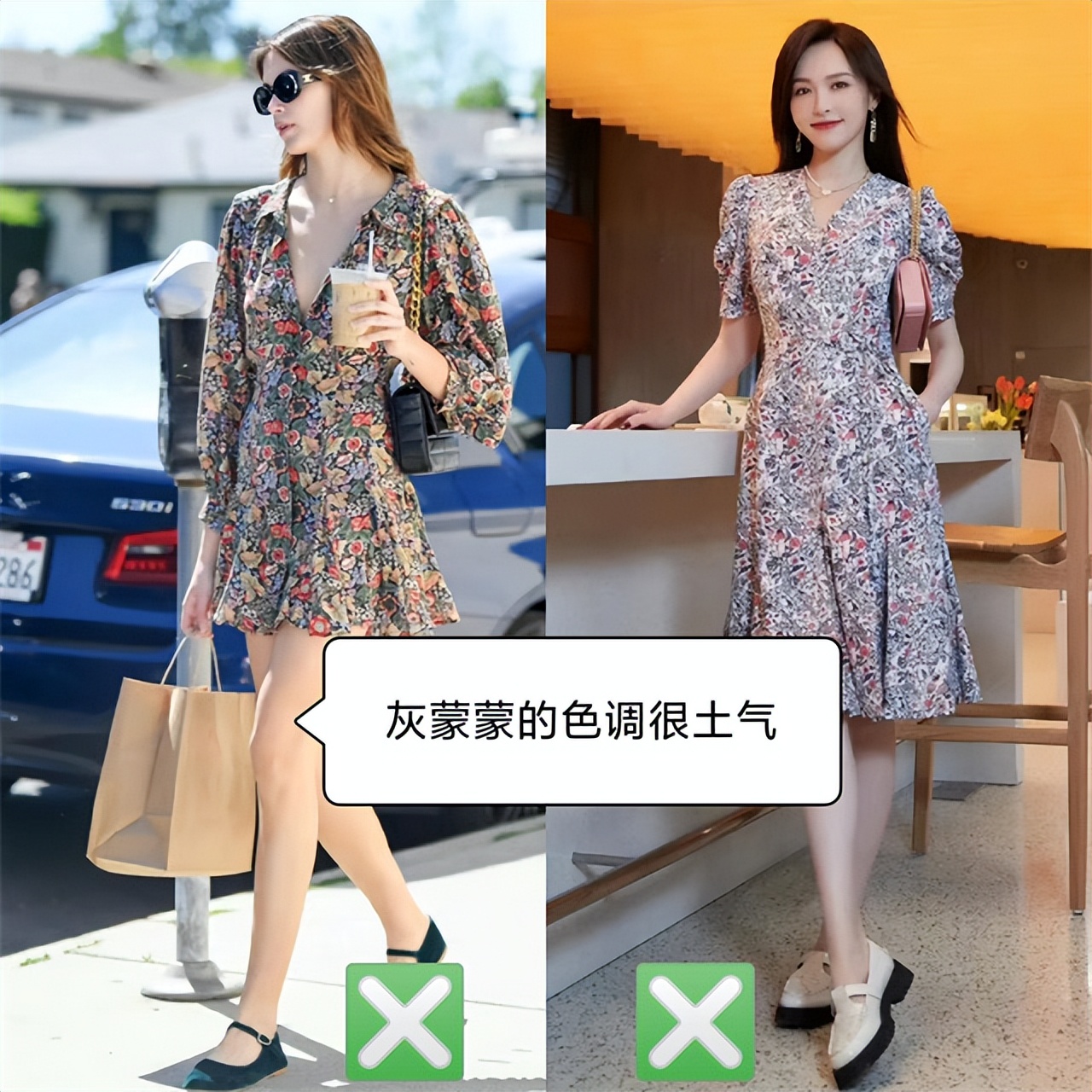 想要碎花不踩雷,首先就别选过于密集和配色,过于花哨的碎花图案。像左边这种密密麻麻的复杂碎花当然要离得越远越好!