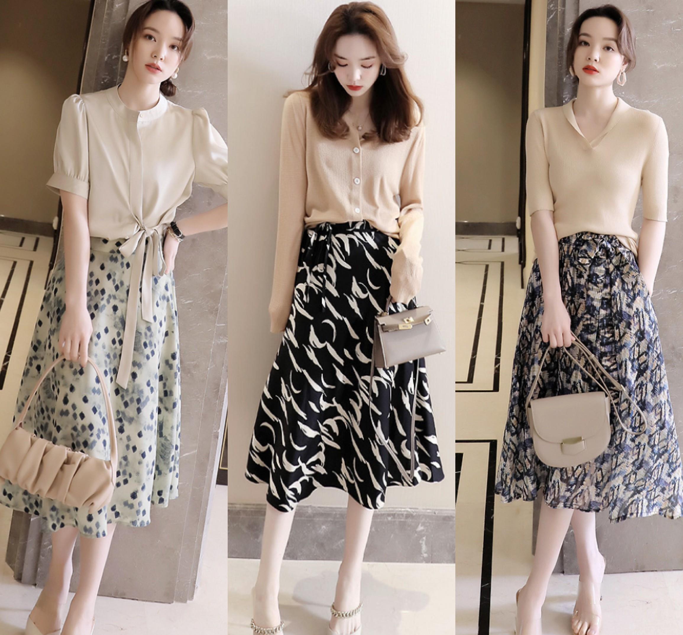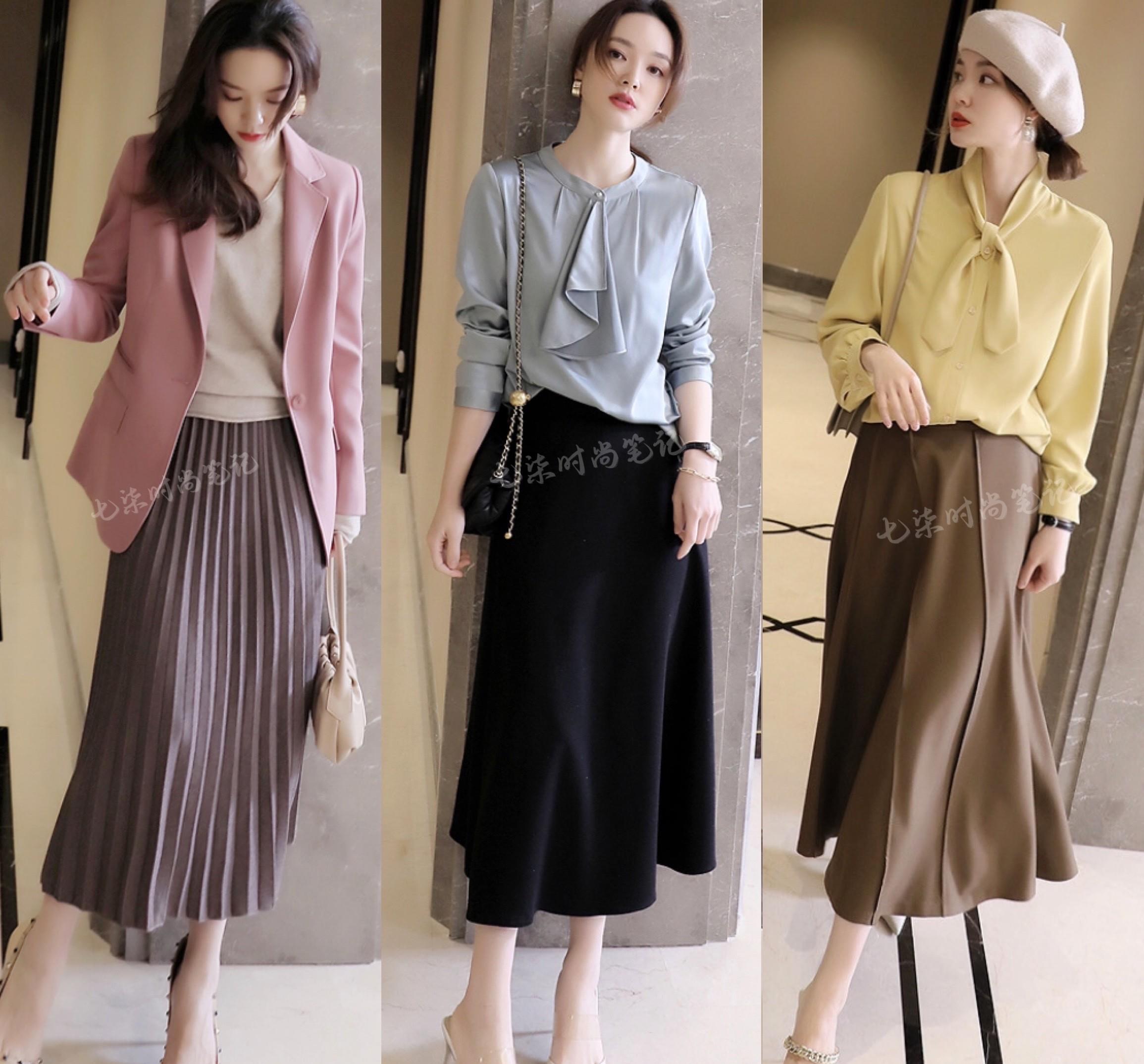 衬衫+过膝半裙 若是上班族,想要穿得大方得体又要兼顾时髦,衬衫+过膝半裙的组合就很值得一试,尤其是搭配灵动飘逸的百褶裙,自带风情万种,将女性的柔美和干练结合,优雅知性又减龄。 一些基础款的衬衫,通勤穿会显