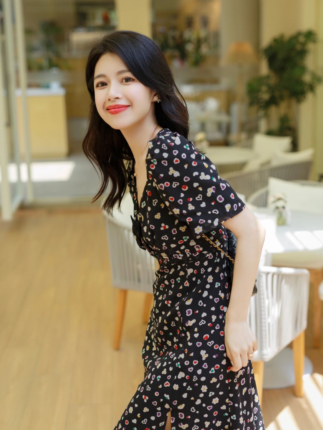 我们接着看第2套穿搭造型,今天这位时尚博主选择的是超显瘦的碎花小黑裙,这样的碎花裙非常耐看,而且普通女生也可以穿出时髦感的款式。