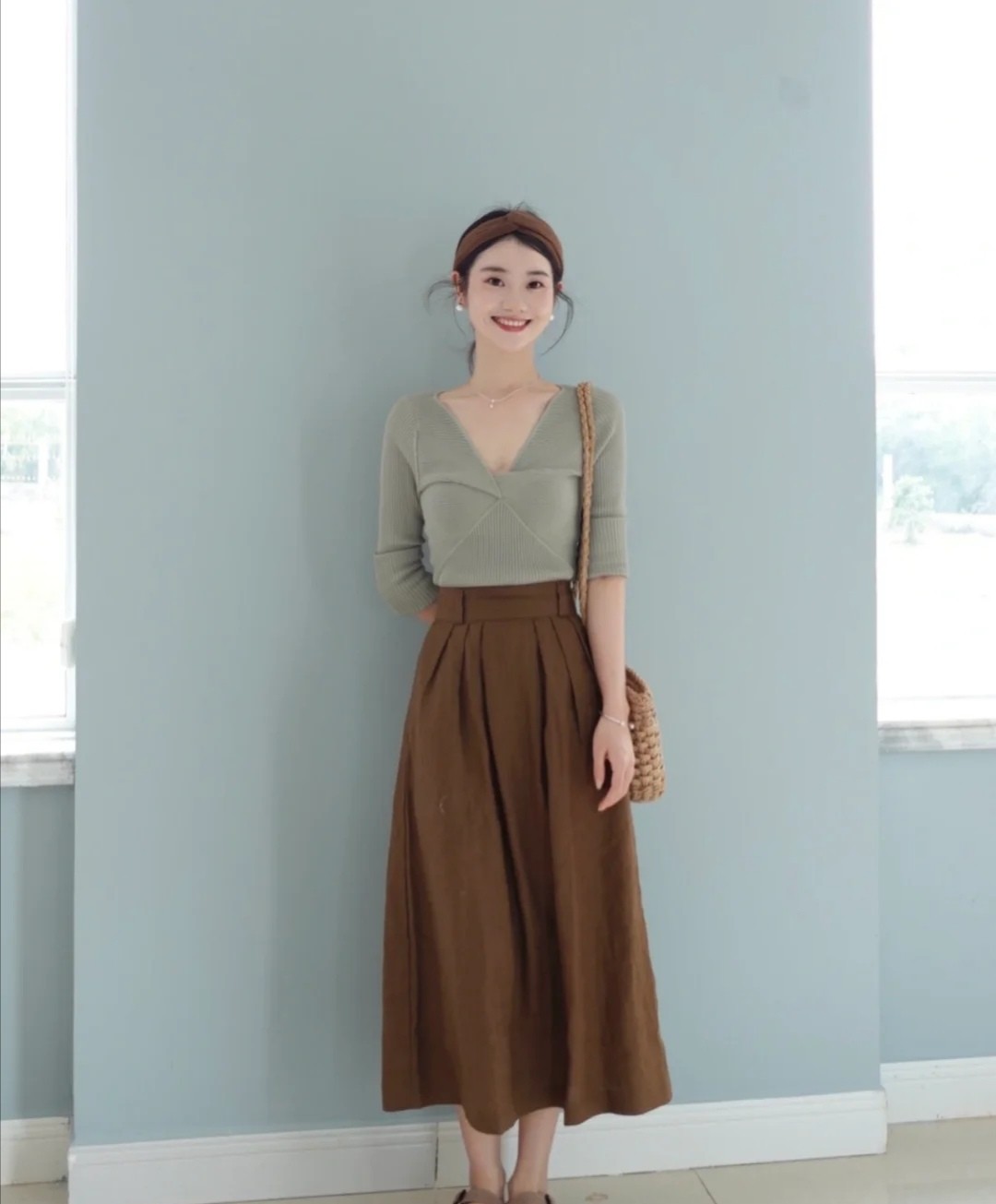修身一点的上衣,可以通过面料描绘出女性体型方面的凹凸有致的视觉效果。像这件上衣,它还有着大一些的V领裁剪,帮助女性把锁骨秀出来,把肩颈线条拉伸拉长,这样才能看起来更加高雅,更有韵味。叠加一款大地色的过膝半裙,带有轻微复古的特质。