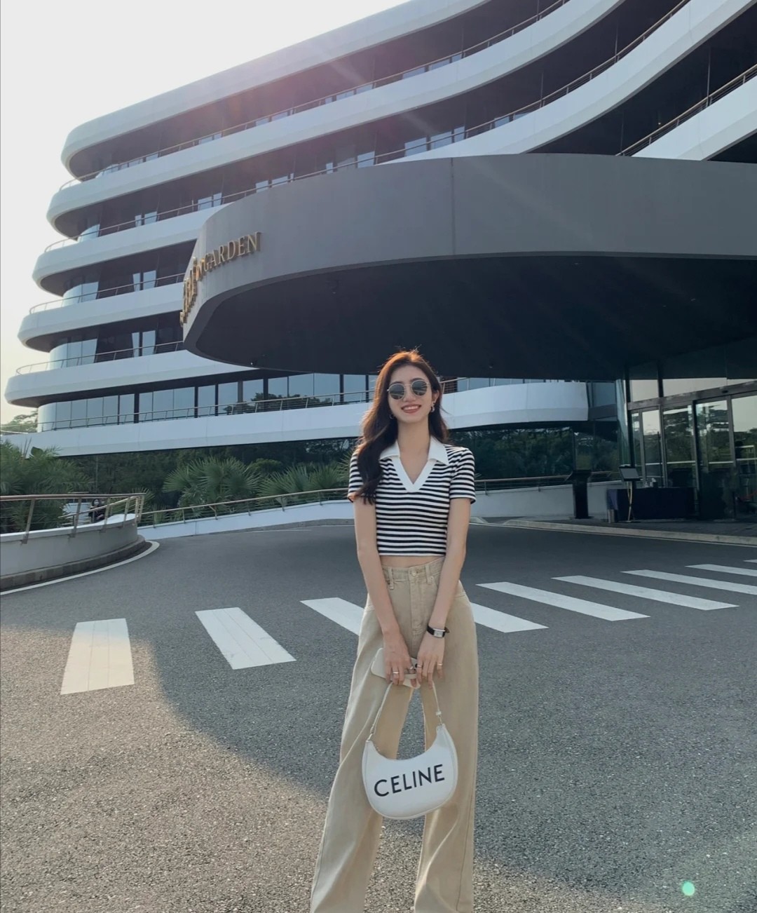 好比这件条纹短上衣,它是POLO领的设计,因此服装呈现出来的运动气息很抢眼,也涵盖着减龄的优势,短小的服装版型,无法把腹部曲线完全的遮掩,让女性透露出纤细小蛮腰。结合长款裤装时,腿部显得更修长。