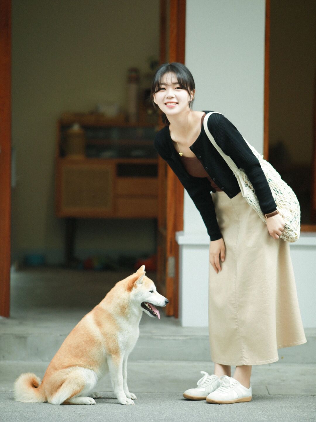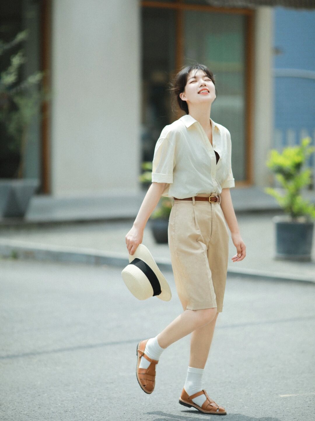 LOOK1:杏色短袖衬衫+卡其色休闲短裤。