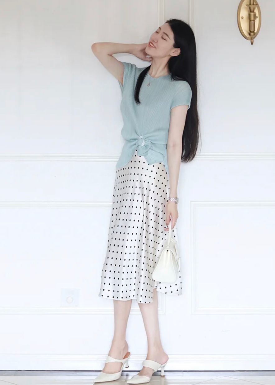 如果你之前因为担心驾驭不了醋酸面料的单品,而选择纯色系的上下装搭配,那么这次不妨试试加入当下流行的潮流元素,如上图中浅色调的蓝色系上衣+波点元素醋酸半身裙,一下子凸显出主次,让你的穿搭更有时髦亮点。而且,精致的小不点在光泽度十足的醋酸裙上,很是俏皮灵动,穿出减龄显年轻的好状态。