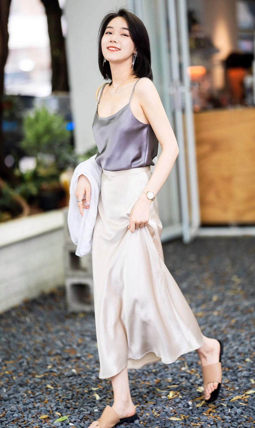 首先,我们很多时候在穿衣打扮方面都有这样的一个烦恼,就是上下装的搭配容易出错,我们今天这里分享的是可以选择醋酸裙的同材质搭配方式,就可以减少很多不必要的纠结。如上图中,选择醋酸面料的吊带衫+醋酸面料半身裙,组合起来毫无难度,立马呈现出你想要的协调感,很是养眼。