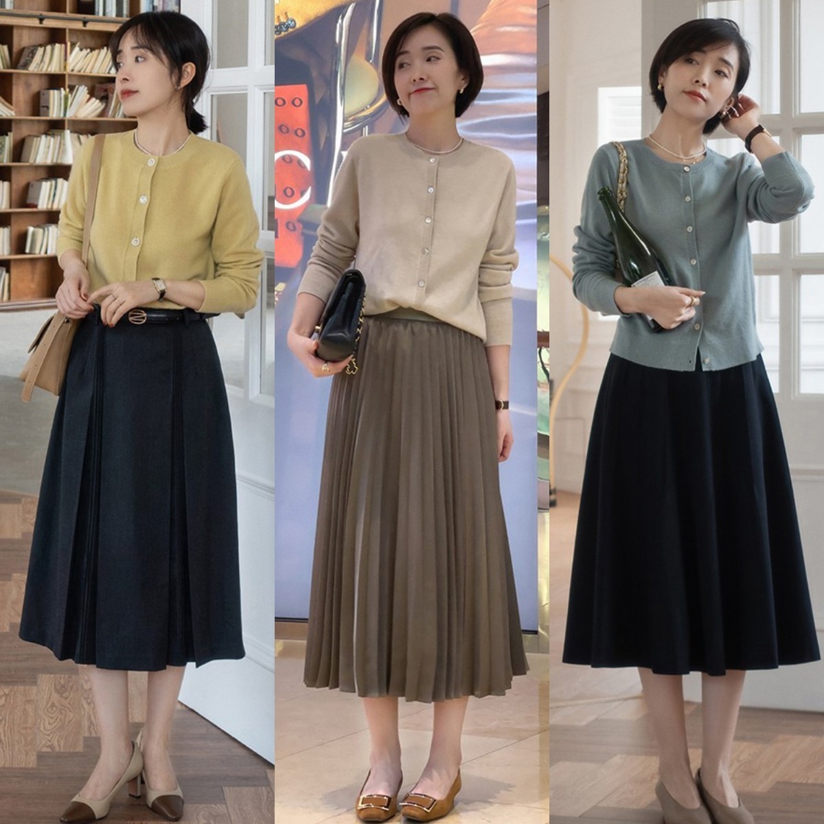相比于明度较高的亮色,内敛沉稳的配色更适合40+的姐妹们,穿出岁月沉淀的气质和温柔。深色上衣搭配酒红色半身裙,兼具质感和高级气质的搭配分分钟穿出满分的回头率,时髦又吸睛。