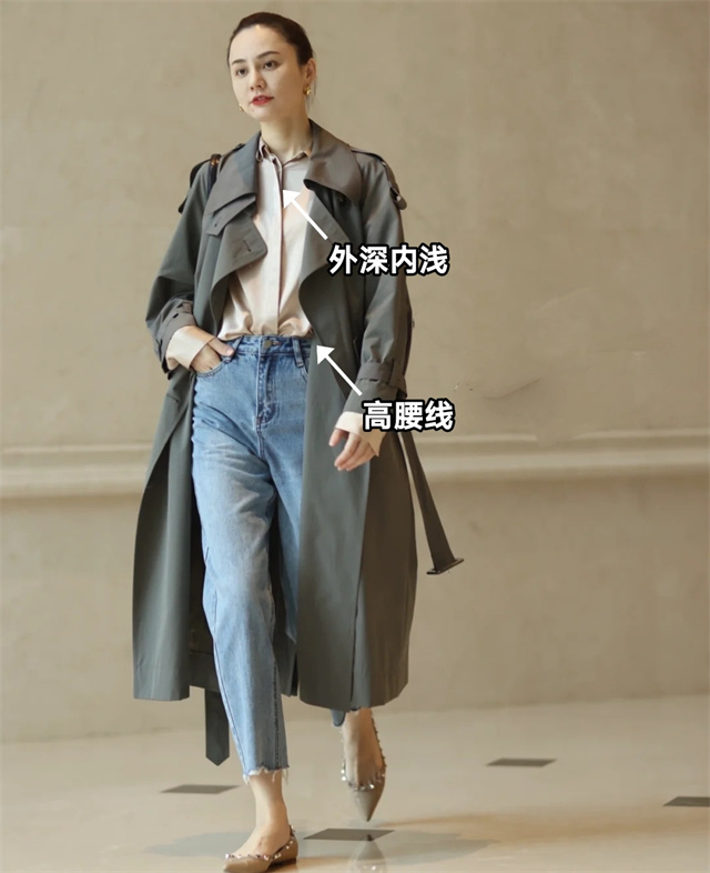 浅色风衣选择h型长款,穿出修长身姿。内搭选择线条简约的直线型裙装或顺色搭配,露出脖颈或锁骨,不用减肥塑形也能有好身材。