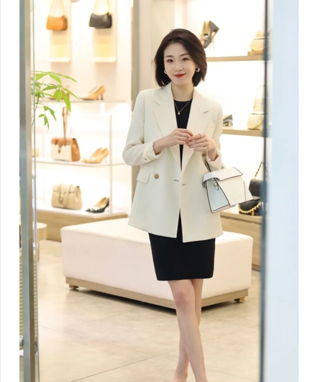 一件简洁的白色小西装,可以在里面叠加同色连衣裙或者是与它色系对比鲜明的黑色裙装。这样的颜色匹配,任何年龄的女性都可以轻松掌控,以黑色波点连衣裙为主,加强优雅的气质,打造出更加简约的配色。