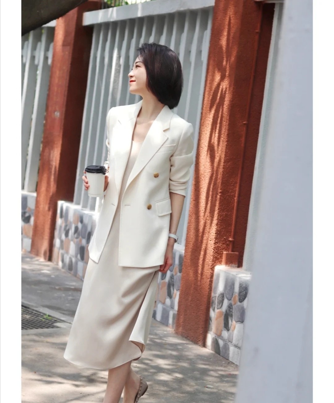 很多女性认为,连衣裙只是夏日的专属,到了气温偏低的时候,它就不会再次亮相,实则不然。可以采取西装和连衣裙配合,弱化它过分肃穆的气息,打造出特别优雅的形象。