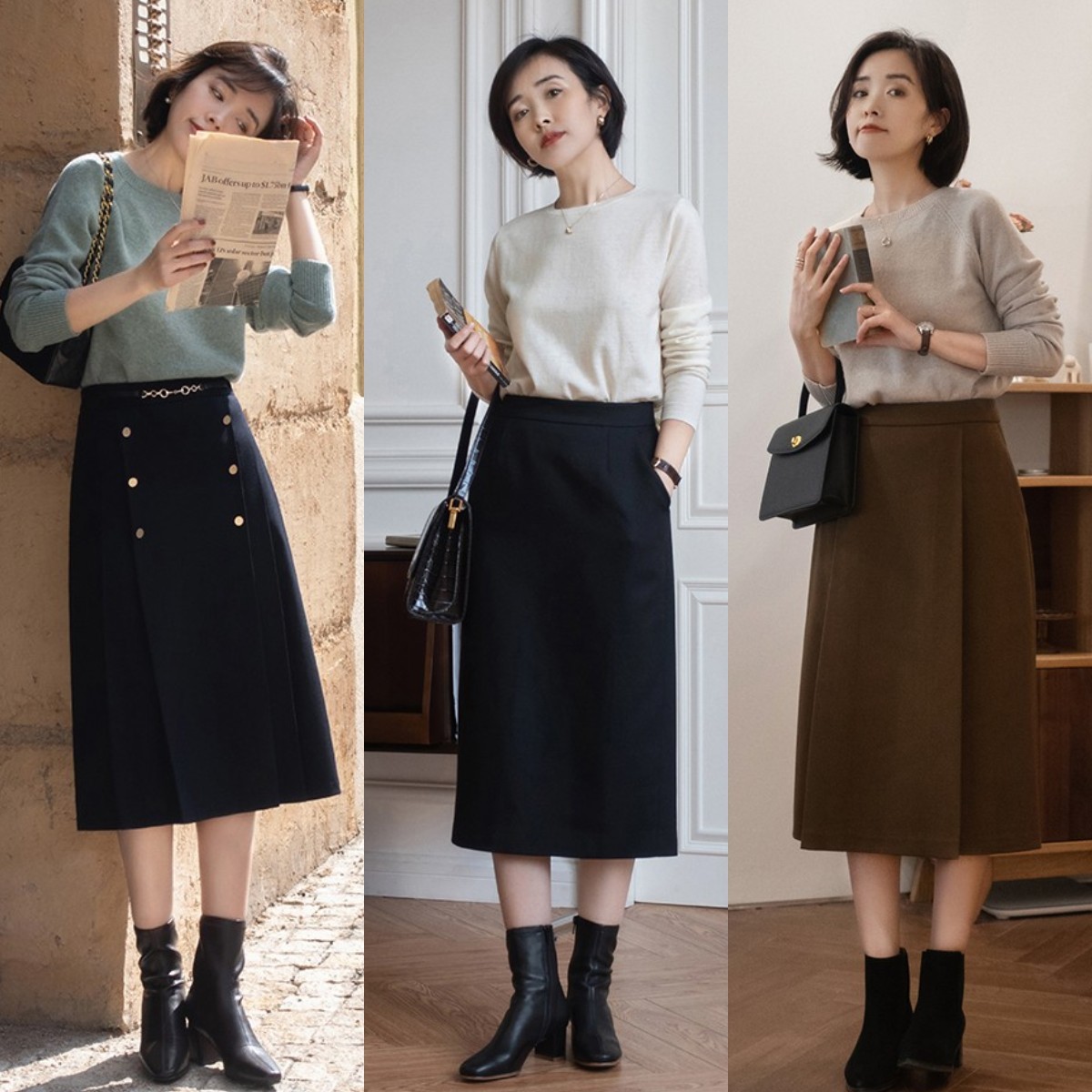 当一款深色的A字裙遇上浅色针织衫,就可以轻松搭配出深浅不一的效果。再适当的采用“塞腰”的方式,对于小个子女性来说,也有很好的增高作用。