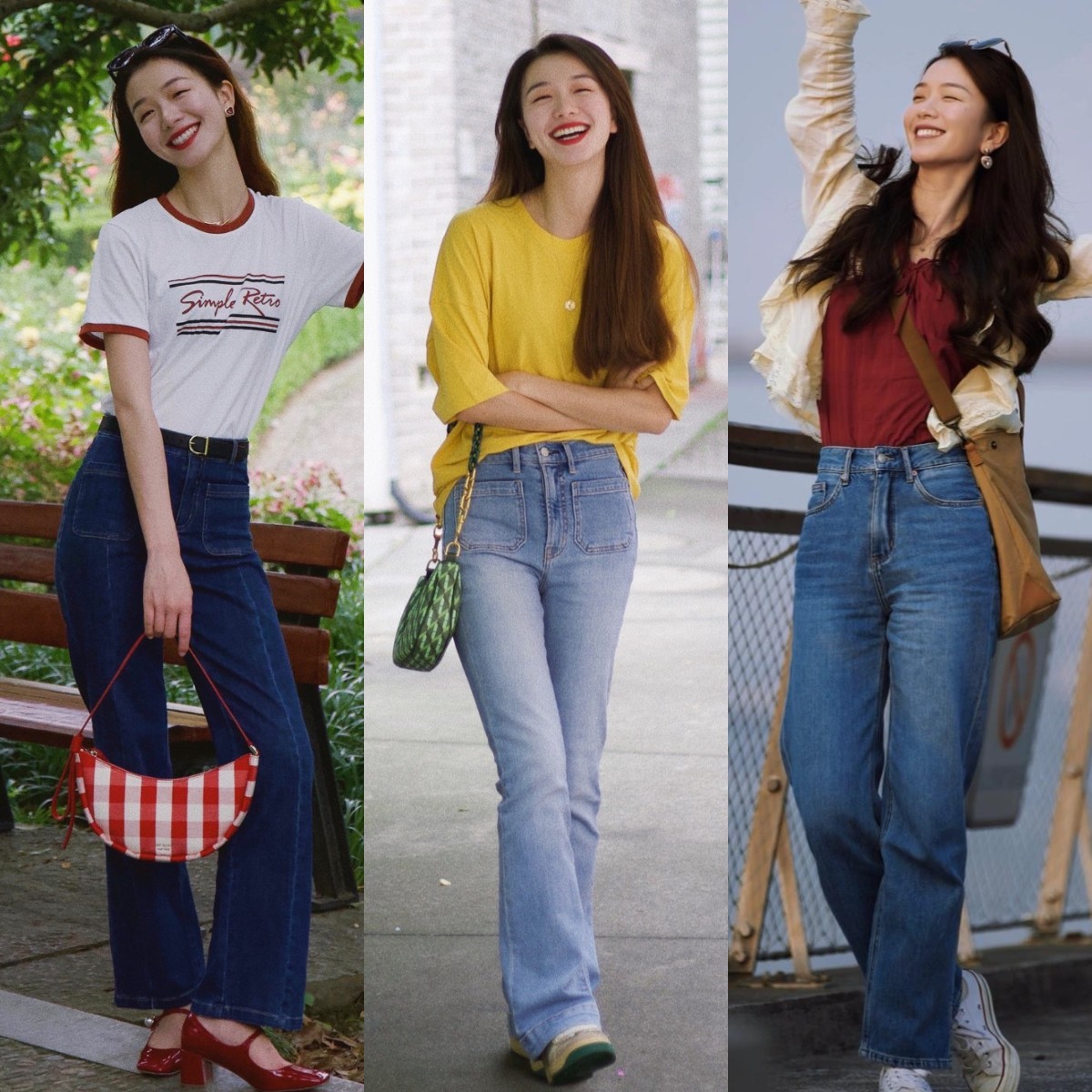 牛仔裤的版型非常多样化,所以我们一定要格外的注重细节处理,其中腰部位置的高度就是很关键的,在选择牛仔裤的时候,必备的条件就是避开低腰线的款式。直接露出肚脐的低腰裤,不管是选择阔腿款、直筒款还是拖地款,都很难秀出好身材。
