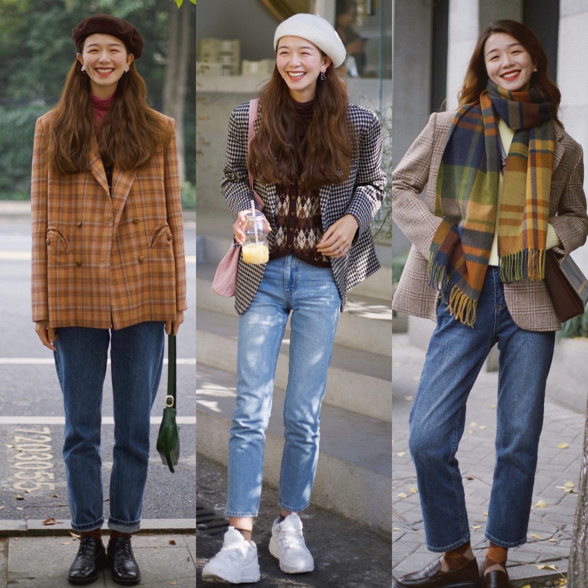 大家在搭配基础款牛仔裤的时候,上衣的选择一定要具备吸睛效果,比如格纹元素的西装外套,或者是一款印花图案的针织衫,都能够让视觉转移到上半身,达到更显高的作用。